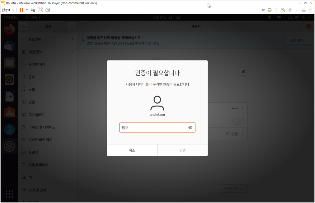 '잠금 해제'를 클릭한 후 인증을 위해 현재 사용자의 암호를 입력하고 '인증'버튼을 누릅니다.