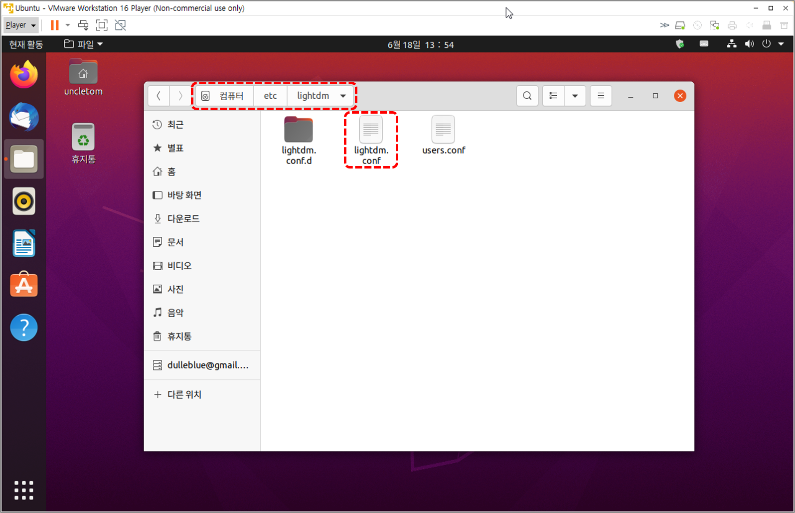 ⓖ 왼쪽 '파일 탐색기' 아이콘을 클릭한 후 '다른 위치' → '컴퓨터' → 'etc' → 'lightdm' 폴더를 선택합니다. 'lightdm'을 정상적으로 설치했다면 'lightdm'폴더와 'lightdm.conf'파일이 생성되어 있어야 합니다.