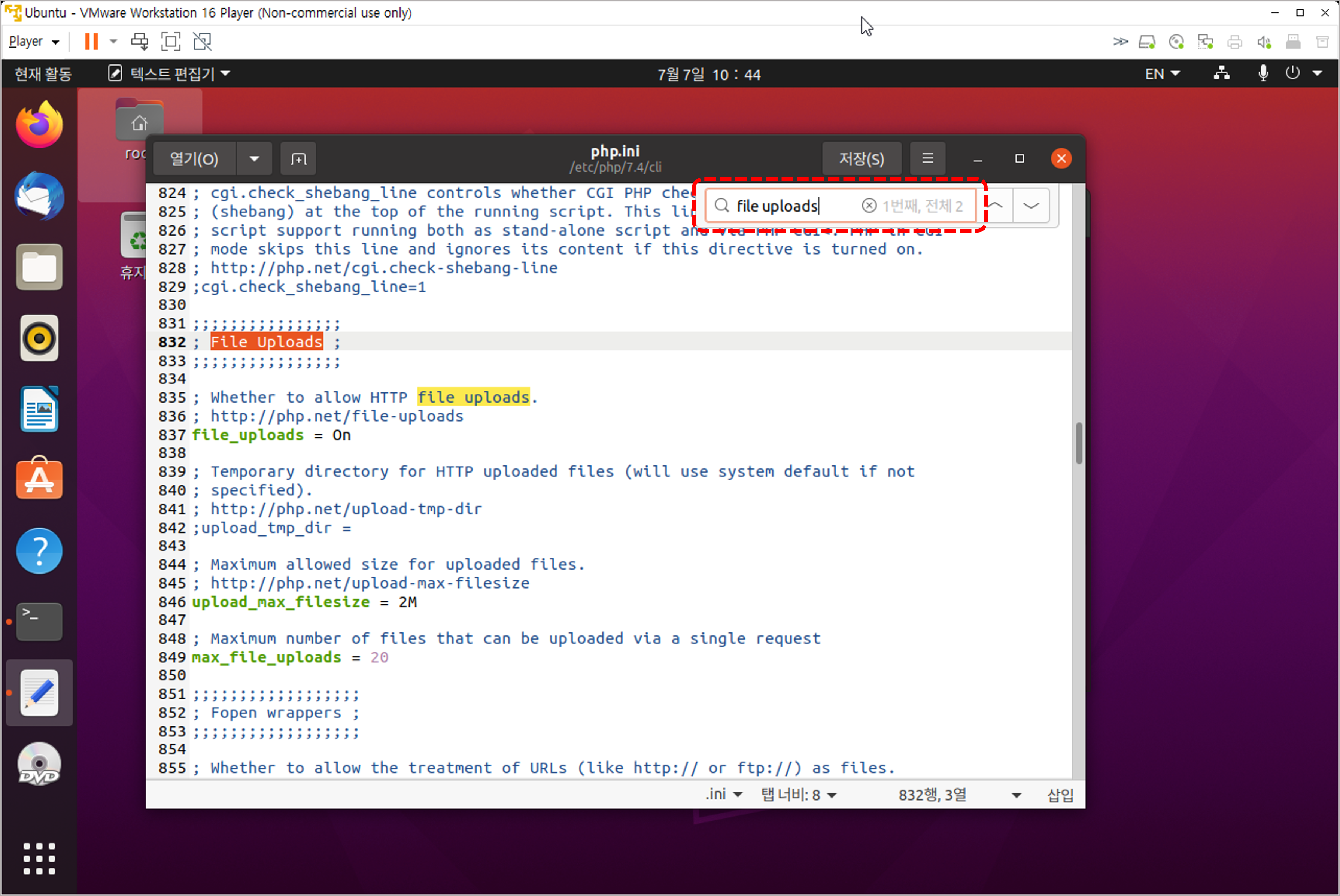 참고로 《gedit》가 아니고 터미널 환경에서 《vi 에디터》를 사용하는 경우에는 《Command Mode》에서 '/'를 입력한 다음 '/file_uploads' 와 같이 입력하면 항목 검색이 가능합니다.