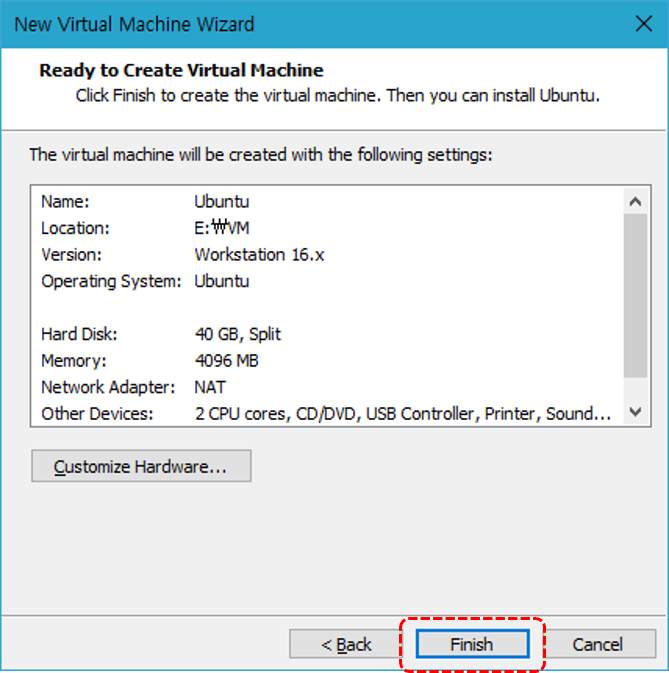 이제 가상머신을 생성할 준비가 되었습니다. 설정한 항목을 확인한 후 'Finish'버튼 을 누릅니다.