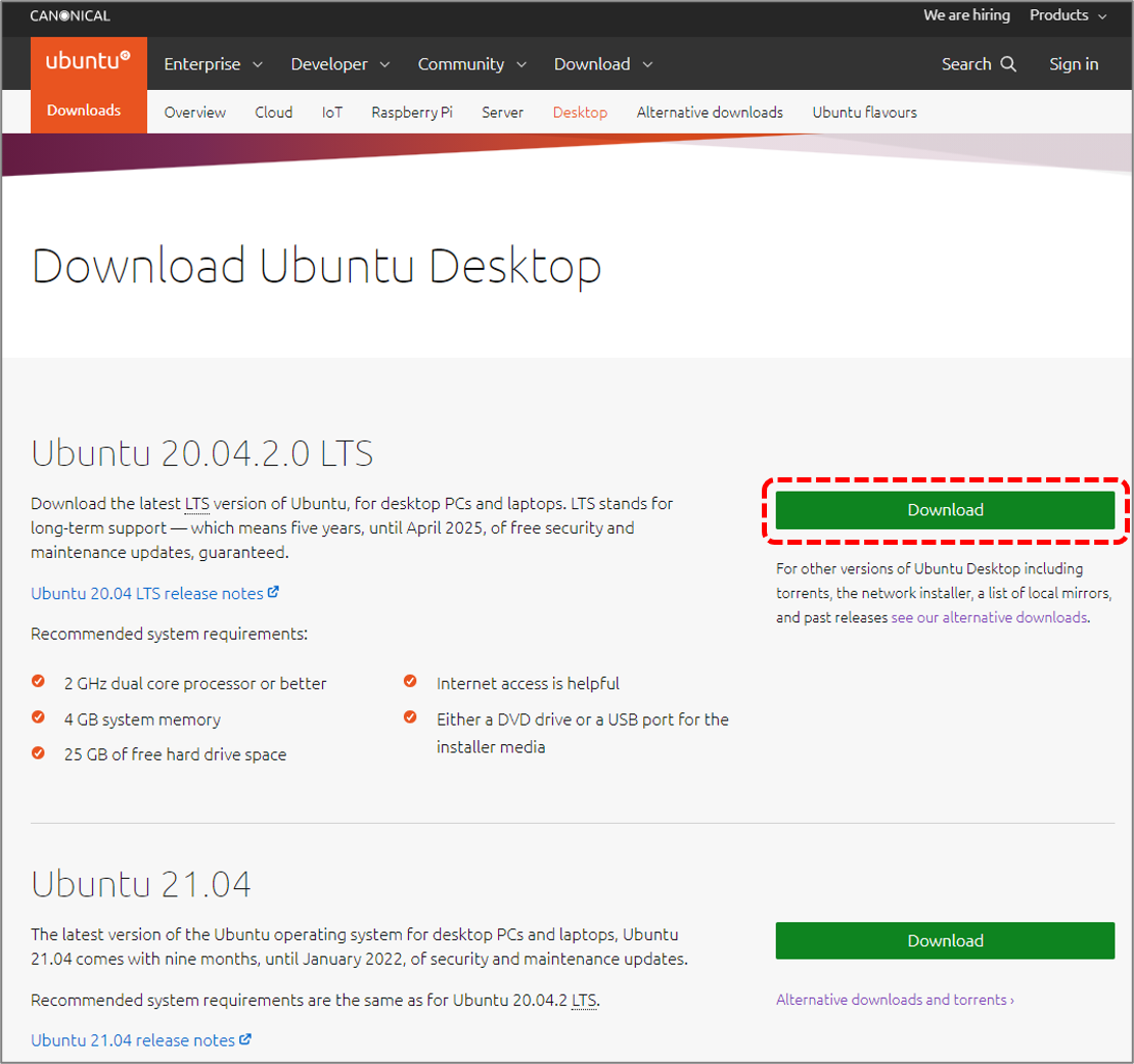 Ubuntu 20.04 LTS 버전을 설치하기 위해서 아래 링크에 접속하여 설치파일을 다운로드하고 임의의 폴더에 해당 파일을 저장합니다.
