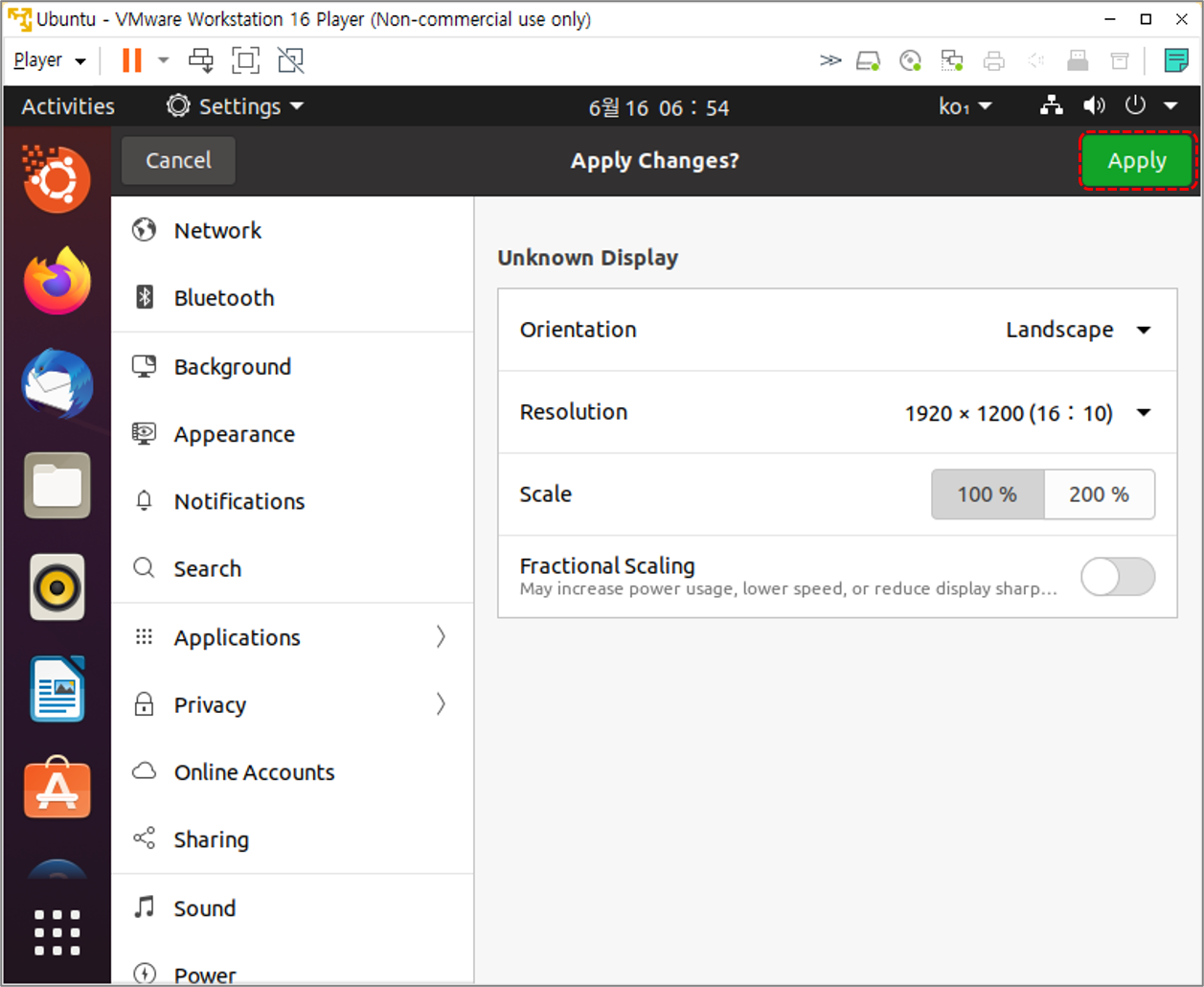 화면해상도가 1920*1200pixel 로 바뀝니다. '화면설정 유지 유무(Keep There Display Settings)'에 'Keep Changs'를 선택하여 지금의 화면해상도를 유지하도록 합니다.