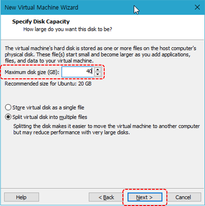 가상머신에서 사용할 디스크 용량을 입력합니다. Ubuntu의 경우 20GB의 용량을 권장하지만 40GB로 지정하였습니다.