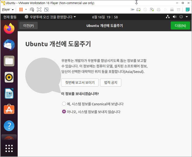 ⓣ 'Ubuntu 개선에 도움 주기' 화면에서 '아니오, 시스템정보를 보내지 않습니다.' 를 선택 후 '다음' 버튼을 누릅니다.