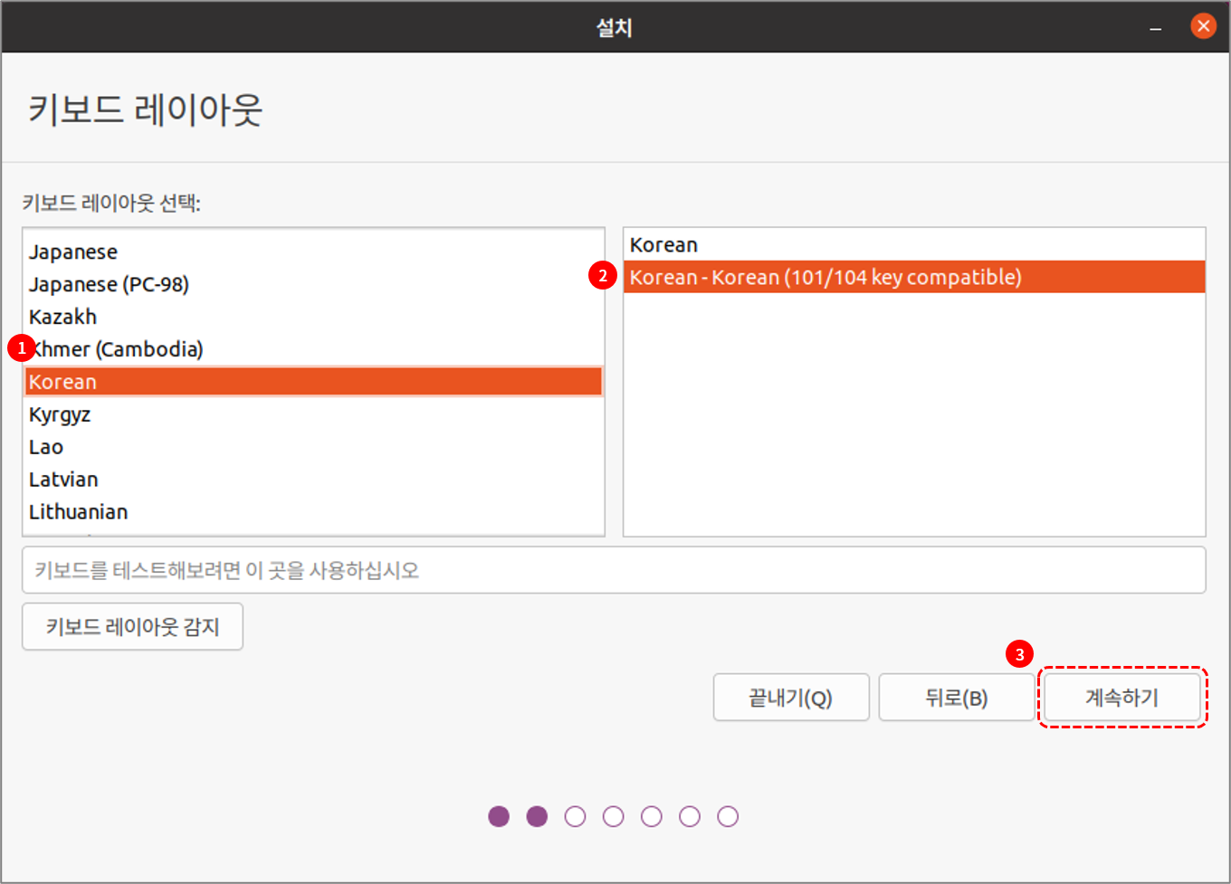 ⓘ '키보드 레이아웃' 화면에서 'Korean - Korean(101/104 Key Compltible)'을 선택한 후 '계속하기' 버튼을 누릅니다.