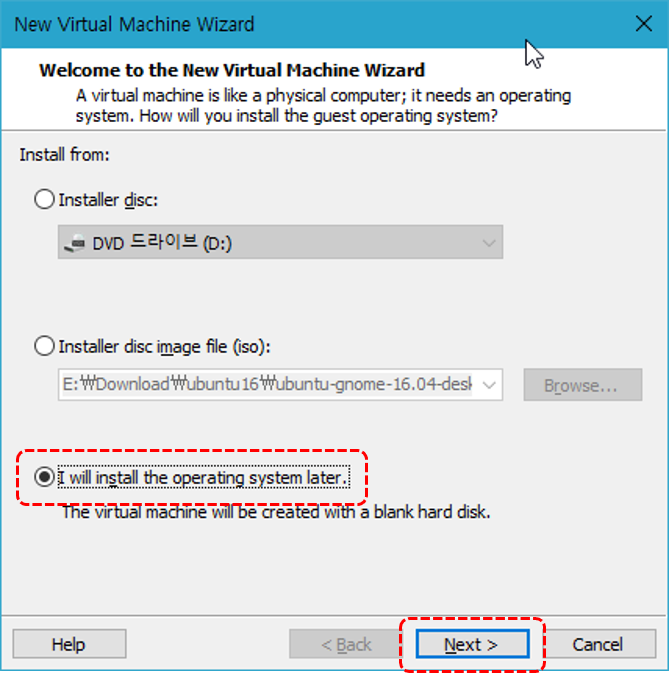 'New Virtual Machine Wizard'화면이 표시됩니다. 우선 운영 체제(Operating System)을 어떤 방법으로 설치할 것인지를 선택합니다. 여러가지 방법이 있지만 여기서는 'Install From'을 'I will install the operating system later(나중에 설치함)'을 선택한 후 'Next' 버튼을 클릭합니다.