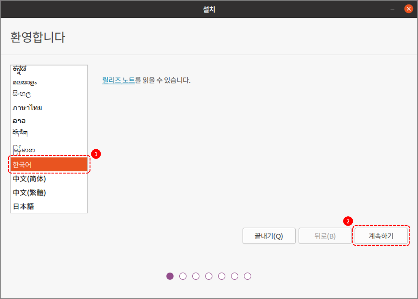 ⓗ '한국어'를 선택하고 '계속하기' 버튼을 누릅니다.
