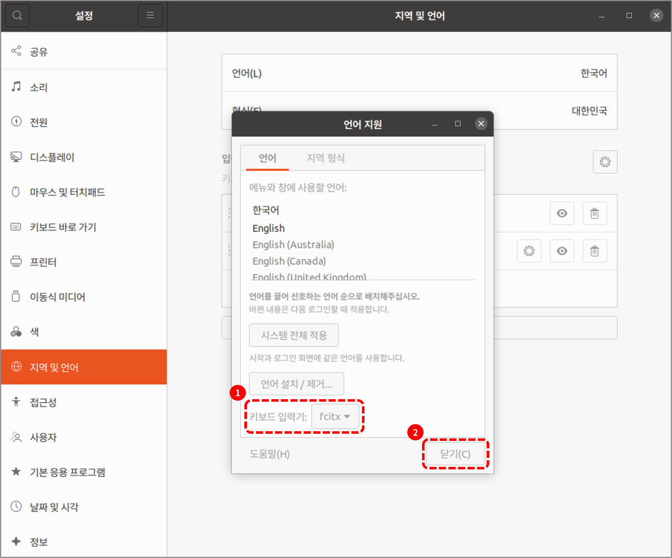 ⓒ '설치된 아이콘' 창에서 하단의 '키보드 입력기'를 'fcitx'로 변경, 선택한 후 '닫기' 버튼을 누릅니다.