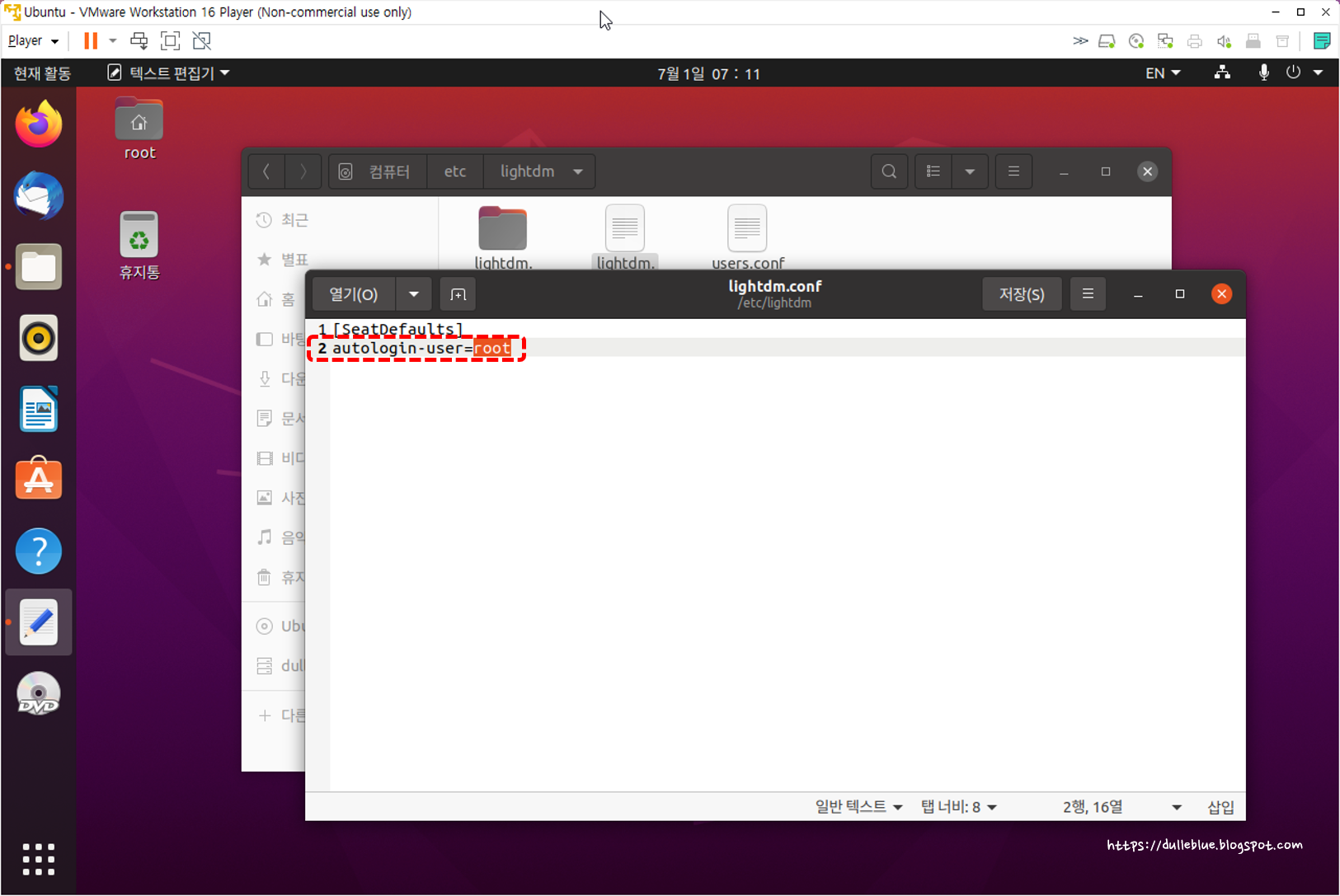 ⓗ 'lightdm.conf'를 실행하여 텍스트 편집기를 열고 'autologin-user'를 'root'로 수정합니다.