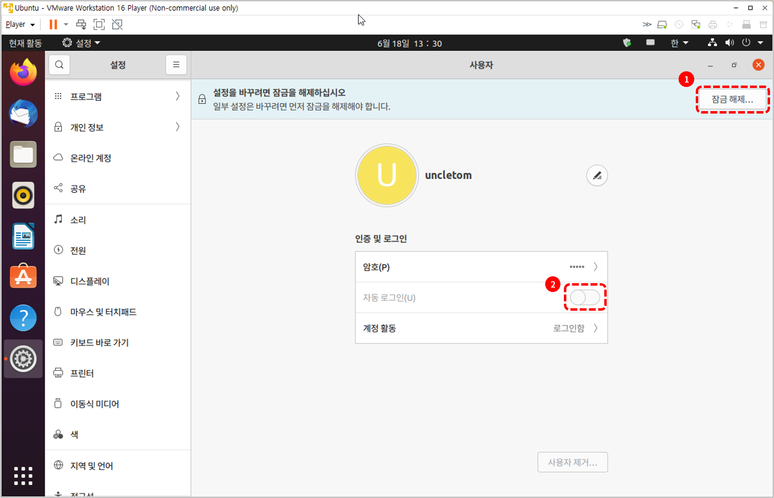 ⓕ 우측 상단의 '잠금 해제'를 클릭한 후 '자동 로그인'을 'ON'으로 활성화 합니다.