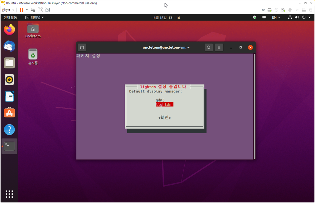 ⓑ 설치가 진행되면서 'lightdm' 설정 중 입니다.' 메시지 창이 뜨면 엔터 키를 누릅니다.